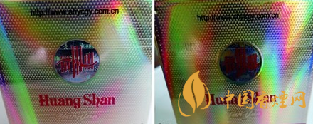 商標紙定位燙金工藝差異對比:真品小盒背面定位燙金,其成像效果字體及圖案清晰完整,且邊緣無明顯脫漆掉色;假煙仿造技術(shù)粗糙,特別是燙金圖案內(nèi)的黃山及“Huangshan”拼音字體無法完整呈現(xiàn)出來,與真品燙金工藝存在明顯差異。